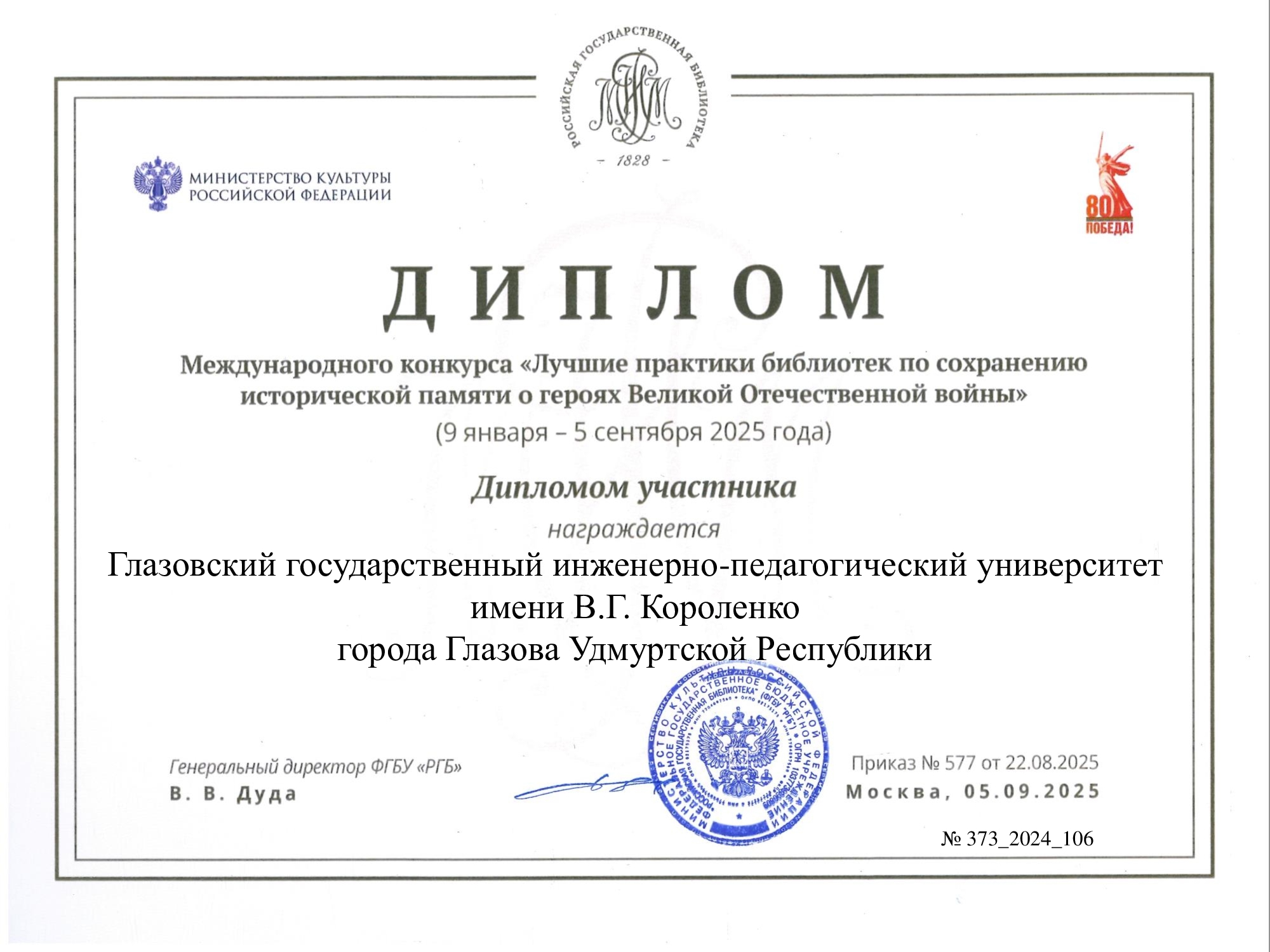Благодарим Бабешко Жанну Александровну и Гуляева Сергея Владимировича за участие в международном конкурсе «Лучшие практики библиотек по сохранению исторической памяти о героях Великой Отечественной войны»!